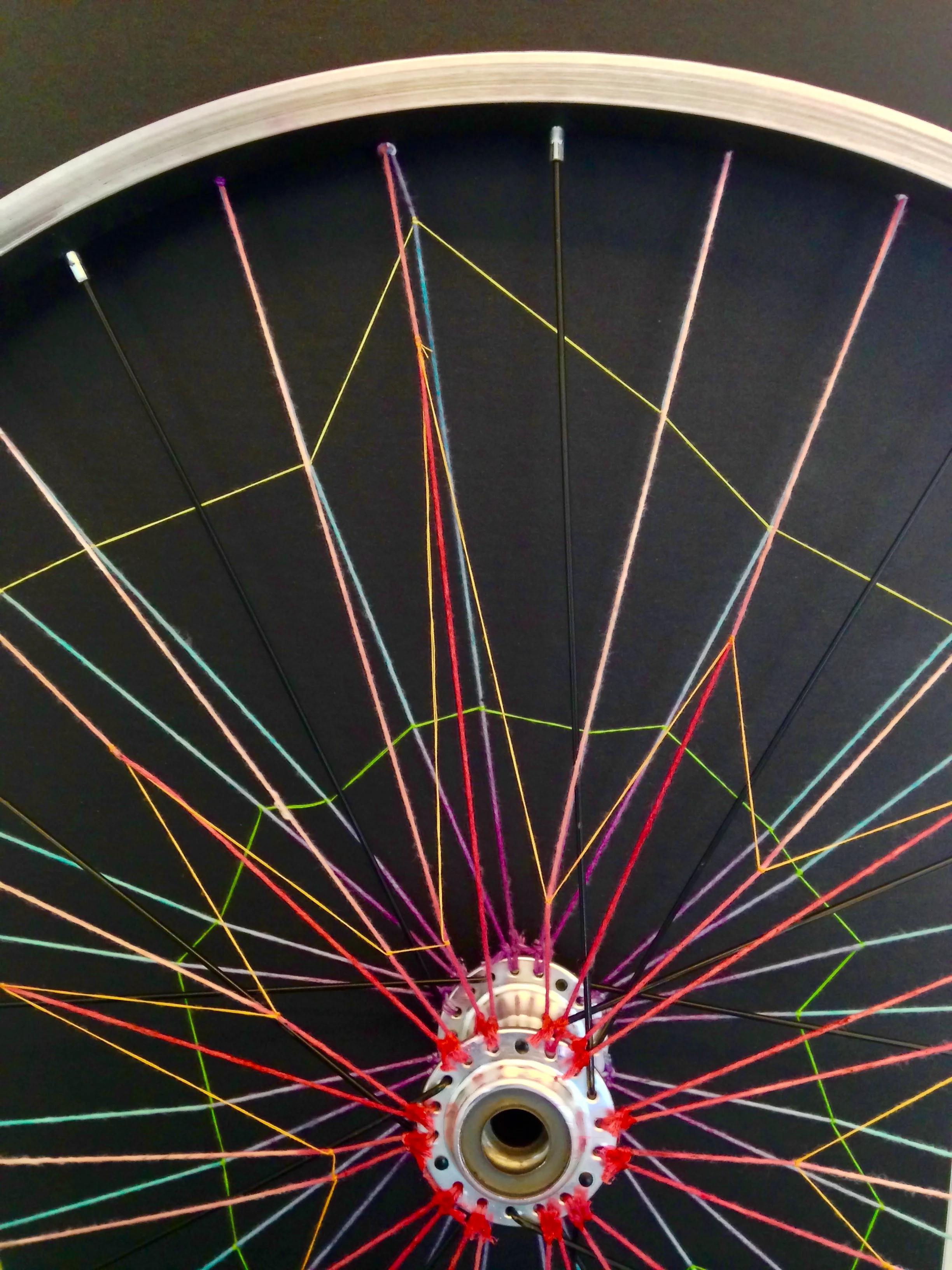 I wanted to experimented with tangible forms of data visualization. I choose to use an old bike wheel that I then modified to display strings of data in the place of spokes. The wheel was suspended, allowing for viewers to interact with the data by spinning the wheel and a 360˚ viewing experience. Data illustrated: Frequency, Distance Traveled, Average Speed, Maximum Speed.